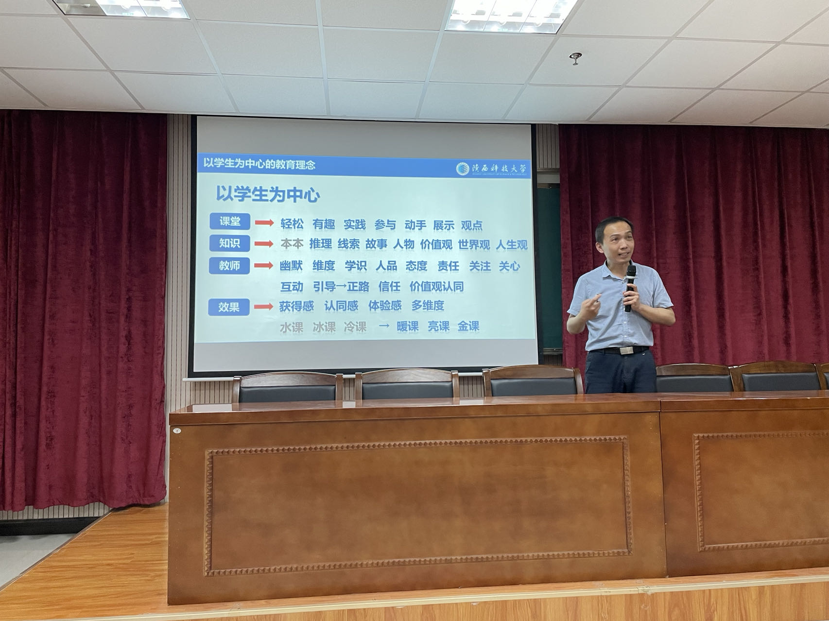 刘庆立围绕课程思政的根本任务、为什么推行课程思政、课程思政改革的探索三个方面,结合钱学森在课程思政中的先行探索实践案例,突出强调了立德树人的重要性。他指出,教师要秉承教育初心,明晰教育本质和规律,践行以学生为中心的教学理念,切实发挥好思政教育在课堂教学中的作用,努力做精于“传道授业解惑”的“经师”和“人师”的统一者,真正成为培养担当民族复兴大任时代新人的大先生。刘庆立老师谦虚严谨的治学态度、精彩生动的教学案例、深入浅出的启发式教学方式博得在场教师热烈的掌声。