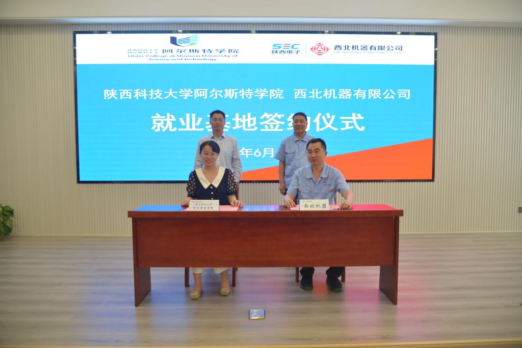 西北机器有限公司人力资源部部长王志岐与阿尔斯特学院院长助理魏倩茹代表双方签订学生就业基地合作协议。