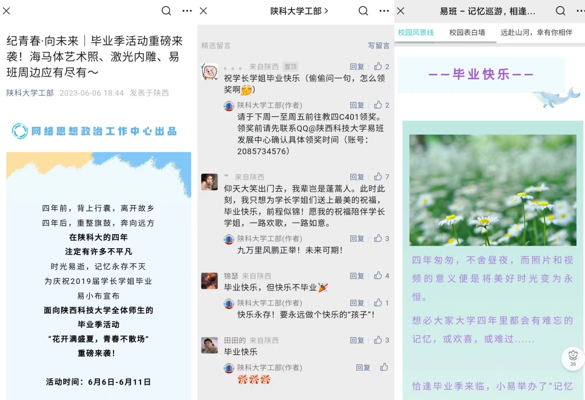 依托易班领衔的“一网两微多端”全媒体矩阵,打造专栏“纪青春·向未来”,发布《纪青春·向未来|毕业季活动重磅来袭!海马体艺术照、激光内雕、易班周边应有尽有~》等原创文章6篇,推出《我为自己画明天》等短视频14部,上线“记忆巡游,相逢有期”等轻应用快搭9个,累计关注量达10W+。
