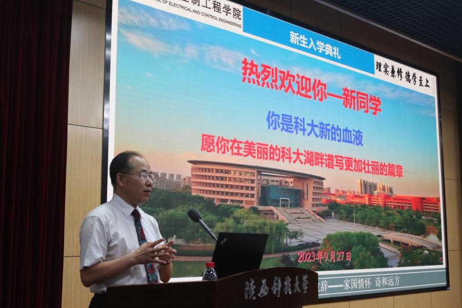 随后,优秀学生代表曹孜涵同学从学习、生活、提升自身能力三个方面为新生们分享经验。2023级学生代表杨坤同学向大家倡议:在大学学习生活中要做到严于律己、尊师肯学、团结同学,呼吁同学们努力培养综合素质,提高自己的实践动手能力。