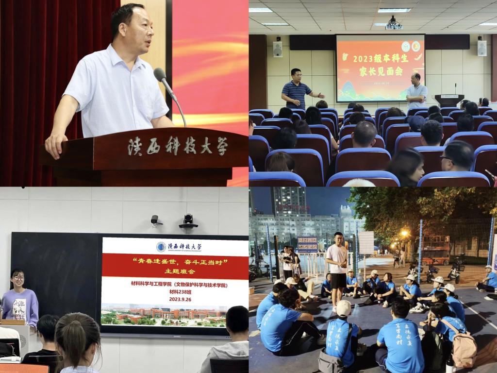 聚焦目标引领 助力适应教育。新生报到当天,材料学院通过举办新生家长见会,走访慰问新生宿舍等活动,加强学院与家庭间的联系沟通,构建家校联动多维责任意识和教育格局;院长朱建锋在“策马扬鞭正当时,矢志笃行立芳华” 2023级新生“开学第一课”中,从学院办学历史入手,希望同学们培养自律品格,树立远大理想,提升综合能力,成为材料力量、国家栋梁;2023级青年教师辅导员举行主题班会,向新生提出了“成才先成人”的殷切期盼,勉励同学们坚定信念,学好知识,以饱满的姿态迎接大学生活;各班班助利用军训间歇开展“按部就‘班’,‘助’力同行”等主题宣讲活动,结合自身经历,引导新生培养良好学习生活习惯,在新的校园中顺利航行。