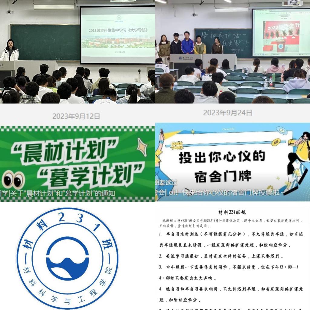 聚焦规矩意识 强化日常管理。通过新生入学教育大会,集中学习《校长李志健在2023级新生开学典礼暨军训动员大会上的讲话》《大学导航》《bet36365路检测中心章程》等教育内容,帮助新生明确学校规章制度,培养新生规矩意识;2023级新生自进入正常教学周起,全员参与材料学院晨材计划、暮学计划,丰富校园生活,保持学习热情,营造了良好的学习氛围和优良学风;各班依照《大学导航》制定《班级规定》及班级标识体系,将个人行为与集体荣誉密切集合,建立向上向好向学班风;学院自管会开展宿舍门牌设计大赛,创造文明寝室环境,创建和谐宿舍舍风;同时针对日常管理、学籍管理、活动参与等开展专项教育,引导学生强化主体意识,激发自律自省。