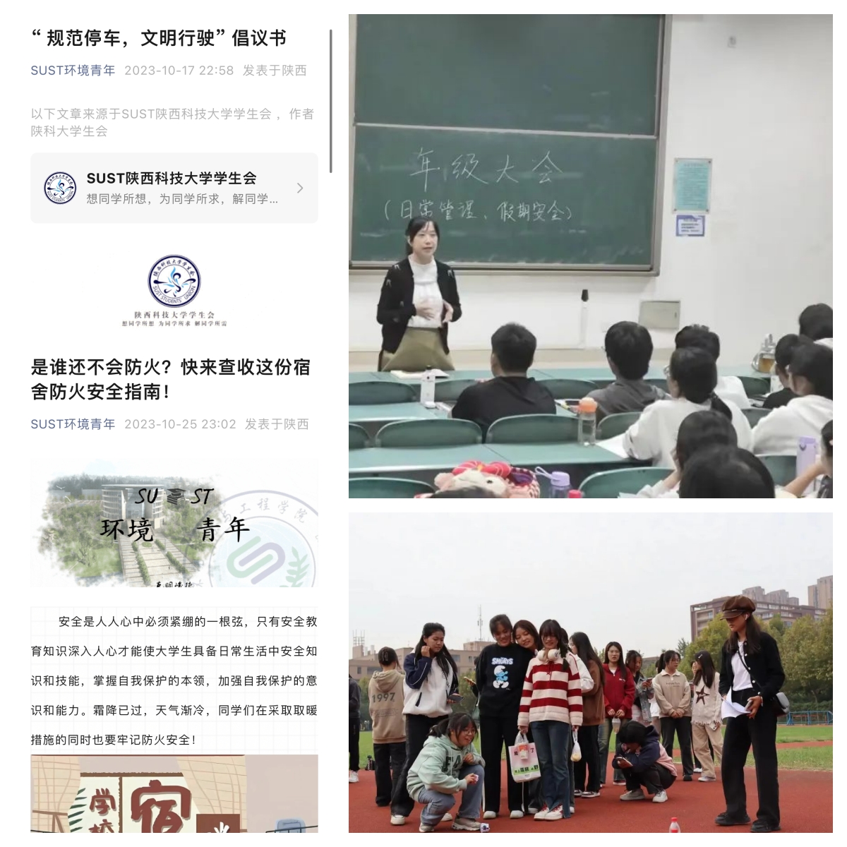 线上线下联动开展秋冬季安全教育。召开“安全教育主题大会”,引导学生不断提高自我安全意识;依托“SUST环境青年”、易班等平台推送“宿舍防火安全指南”“规范停车文明驾驶倡议书”“1010心灵之旅”“民法典亮生活”等网文,不断提高广大学生自我安全能力;举办“寝室文化节”,以校园安全为寝室文化主题,积极开展用电安全、心理健康教育等,推动形成人人讲安全的校园氛围;依托科研团队,落实学生管理责任,严防电动车进实验室、宿舍等场所充电。