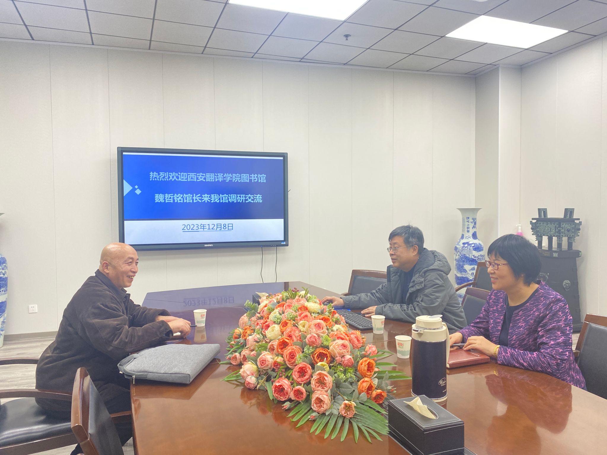 12月8日上午,西安翻译学院图书馆馆长魏哲铭一行来36365官网图书馆就智能盘点、资源建设、人才建设等工作进行调研交流,图书馆馆长王海刚、副馆长郑勇参加了座谈。