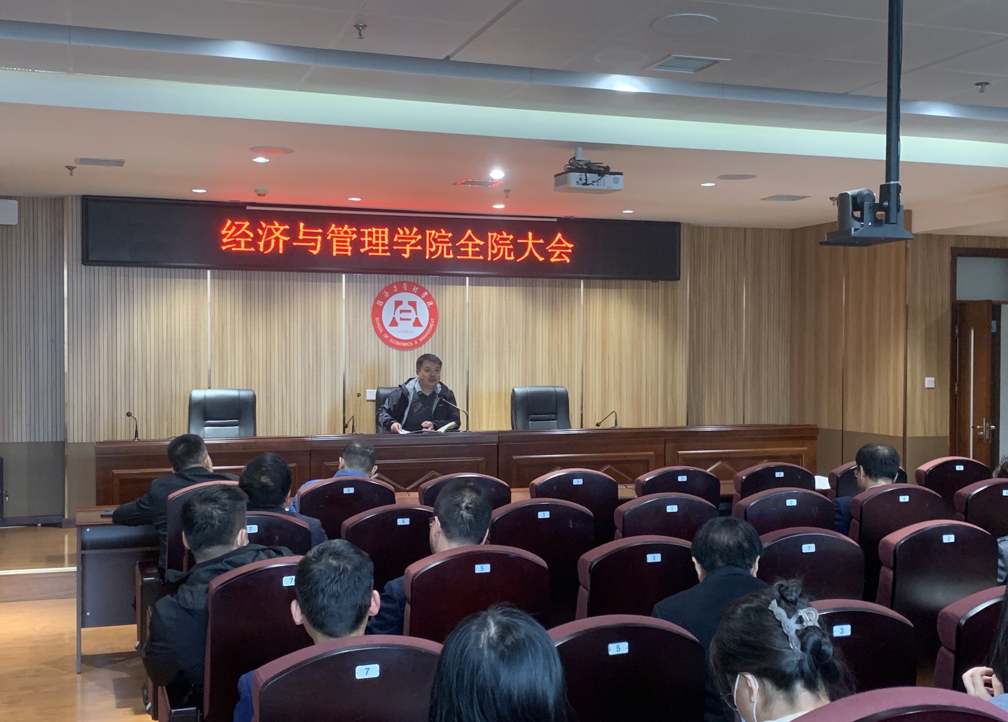 3月27日下午,经济与管理学院(亚欧贸易与数字经济学院)在人文楼A712召开学院教职工大会,对学校“双代会”精神进行专题学习。会议由学院党委书记崔楠主持,学院班子成员和全体教职工参加会议。