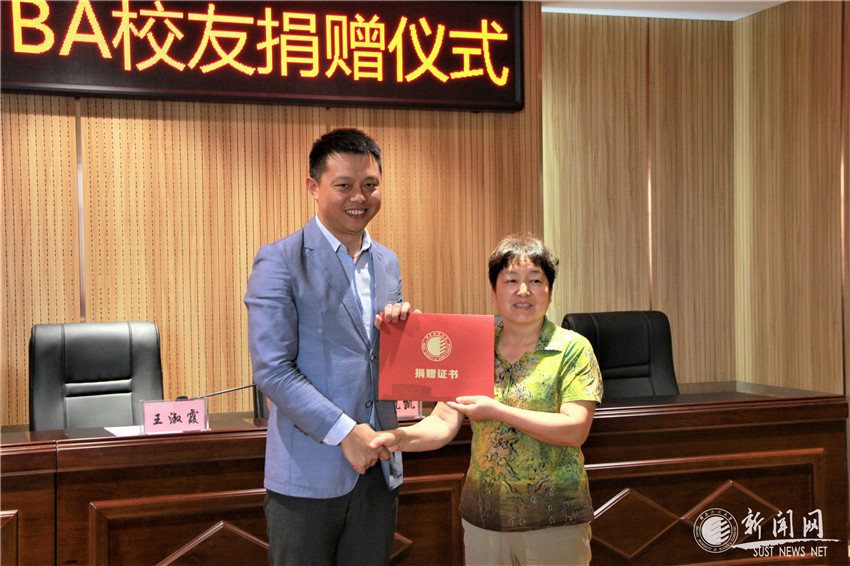 王淑霞代表学院接受捐赠,并向2017级MBA联合会主席吴鹏颁发捐赠证书,感谢同学们为母校送上的深深祝福。