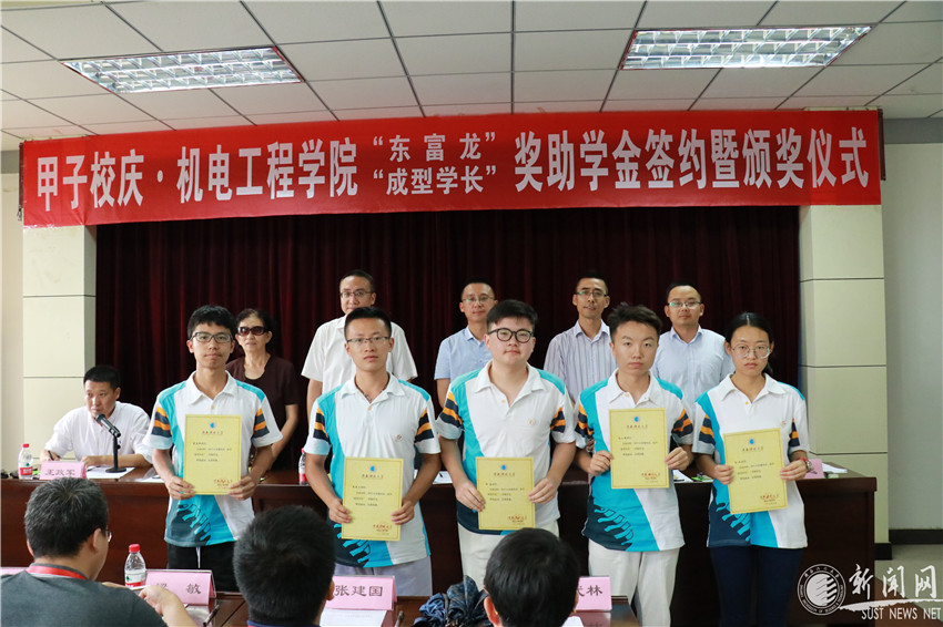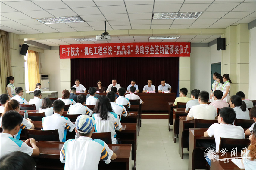 6月26日,在甲子校庆之日,“东富龙”、“成型学长”奖助学金颁奖仪式暨校企合作签约仪式在机电工程学院圆满举办。上海东富龙科技股份有限公司人力资源部经理顾为祥,成型专业002班班主任王玉茹及校友代表梁敏、张建国、李武林,机电学院负责人和获奖学生及师生代表参加。大会由学院院长助理王政军主持。