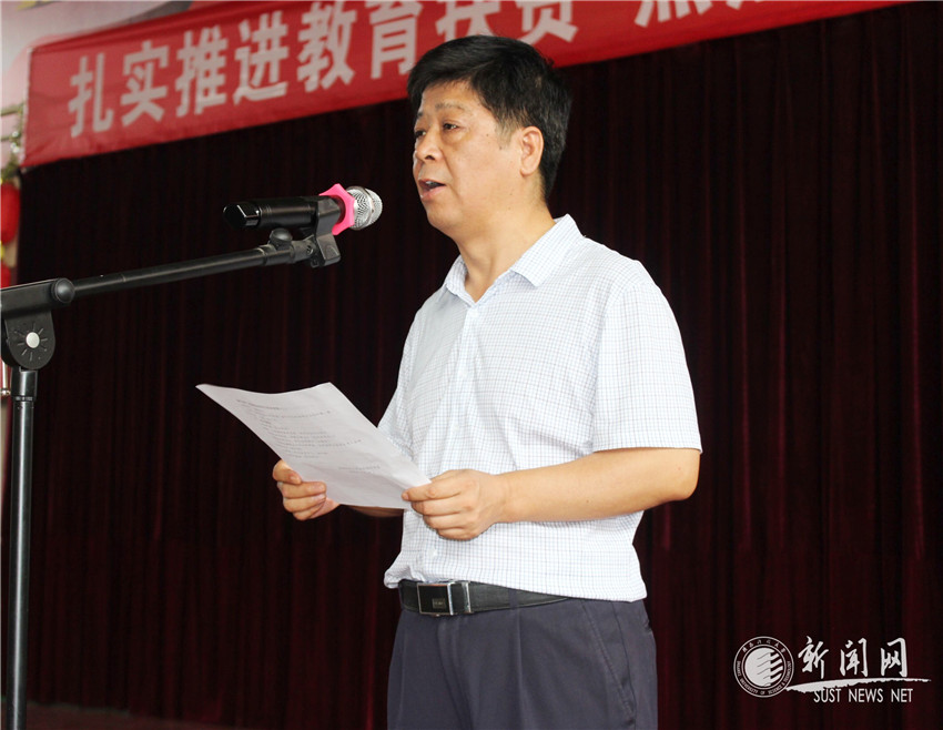 田进喜首先向附中给予受助学生的帮助表达深深的感谢,并指出由于印台区经济相对落后,仍然有许多学生因生活困难影响学业,陕科大附中对印台区的教育扶贫政策是全区教育扶贫开发的重要组成部分,得到了印台区社会各界的积极响应和大力支持,让印台人民感受到了一份难得的人间真情和温暖大爱,体现了陕科大附中对社会的责任感。希望这十名受助帮扶同学,珍惜机会,不负众望,刻苦学习,遵纪守规,以优异的成绩回报附中各位领导老师,报答自己的父母。