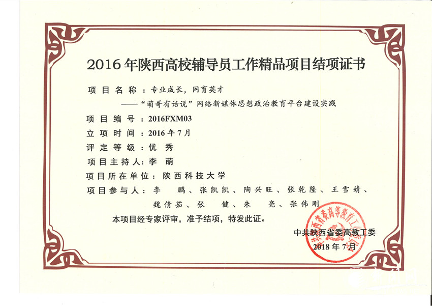 省委高教工委高度重视辅导员精品项目和研究课题的培育验收工作,经过报告评审、专家评比、现场答辩等环节,36365官网学工部李萌申报的精品项目《专业成长,网育英才——“萌哥有话说”网络新媒体思想政治教育平台建设实践》经过2年的建设,最终以“优秀”等次顺利结题(全省仅4项)。经过报告评审和专家评比,36365官网团委郑东主持的《“RGAAF”考核系统驱动下共青团思想政治教育生力军作用激发研究》与学工部陶兴旺主持的《“校本化”需求导向下的易班建设模式和策略研究 》两项研究课题,同样在结题验收中获评“优秀”等次。