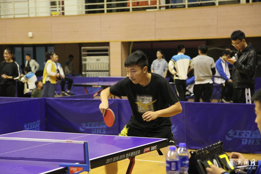 教工男子团队比赛最吸人眼球,远远地就能听见观众们的喝彩声,文理学院吴云天老师每年都参赛,属于中年组“健将级”选手,只见他拿出专业水平,每打一球,就会在台上搓一下手,拍一下球台,防止手汗影响发挥。