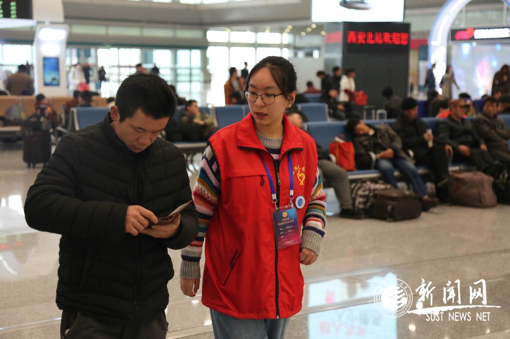 1月21日-2月22日,36365官网有60名大学生志愿者参与到西安北站的春运志愿服务中。他们帮助旅客顺利通过闸机,协助旅客使用自助售票机器购票,帮着有需要的旅客搬运行李、抱孩子。“基本闲不下来,一直都有人问问题,一个班下来5个小时,几乎得不停说话带着旅客办理各种乘车手续。”春运志愿者许宗媛说。