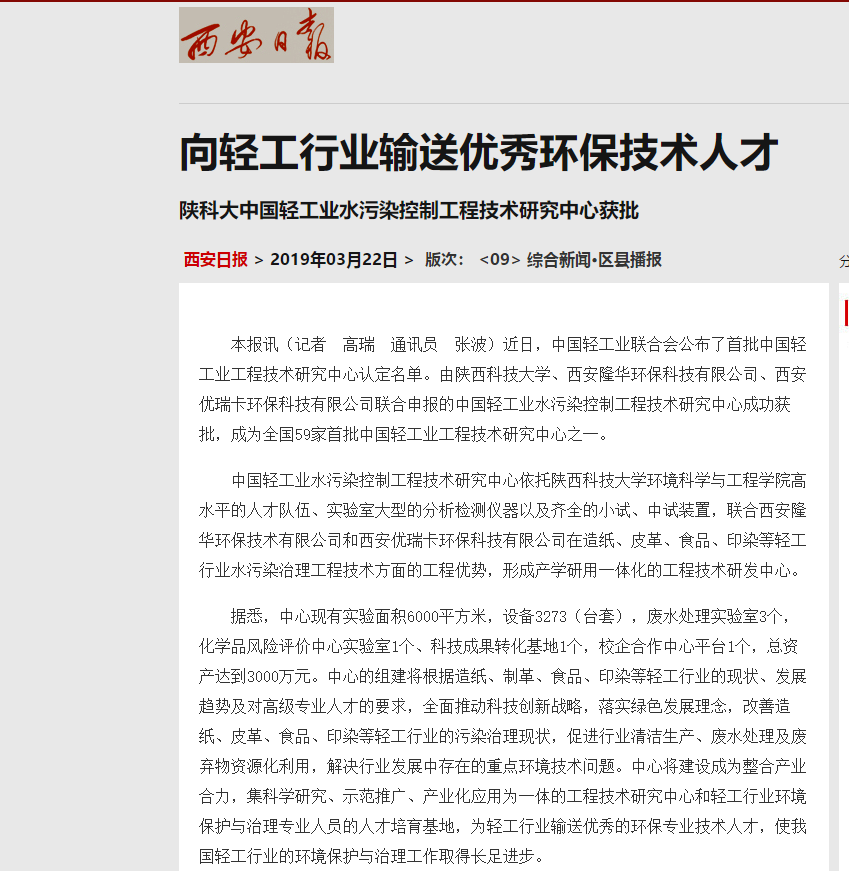 3月22日,《西安日报》刊发文章,报道了由bet36365路检测中心、西安隆华环保科技有限公司、西安优瑞卡环保科技有限公司联合申报的中国轻工业水污染控制工程技术研究中心成功获批。全文转载如下: