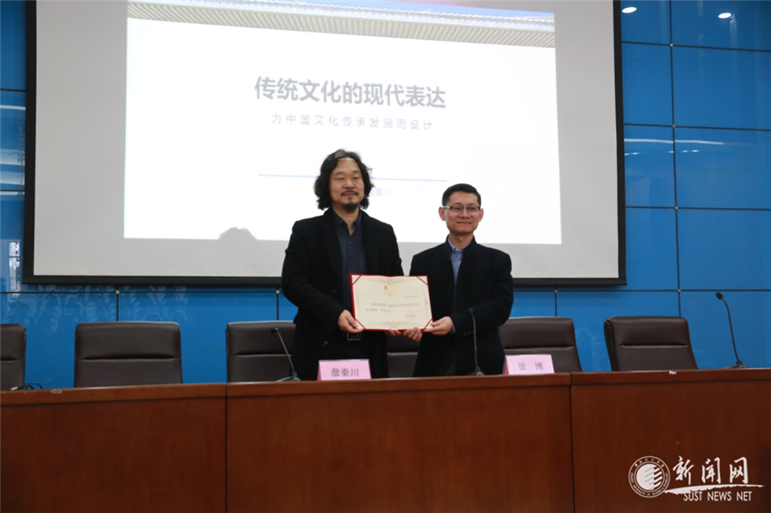 3月21日,詹秦川教授为山东青年政治学院师生作了题为《传统文化的现代表达》的学术报告,工业设计、产品设计、环境设计等专业百余名师生听取了报告。讲座从中国传统文化传承发展展开,结合丰富的实例指出:设计要打破思维定式,我们要运用开放性的头脑去做设计;在当今的设计实践过程中,也可以运用新型材料和传统工艺结合的方式,进行积极的设计创新。最后,詹秦川教授还为大家逐一分析了平面设计、时尚设计、交互设计、工业设计等方面的前沿动态。报告取得了圆满成功,引起了师生强烈的反响。学术报告结束后,院长张博颁发聘书聘任詹秦川教授为该学院客座教授。
