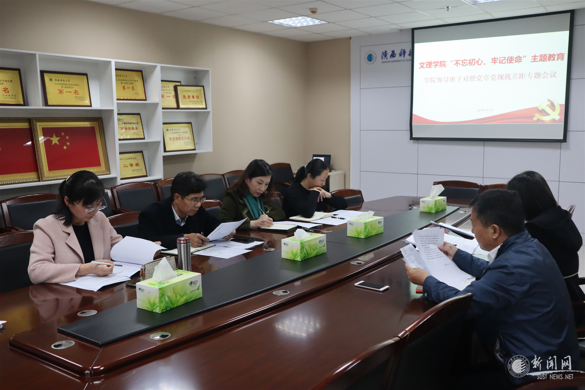 按照中央精神和学校党委有关要求,文理学院于11月12日下午召开学院领导班子对照党章党规找差距专题会议。学院全体班子成员参加会议,会议由院党委书记陈源梅主持。
