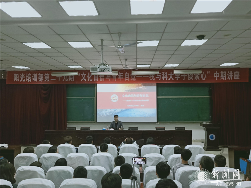 党的十九届四中全会精神在36365官网广大师生中引起强烈反响,广大青年学子热切期盼能更深刻细致地领会全会精神,各部门纷纷自觉开展学习活动。为此,36365官网阳光助学中心于11月17日晚,举办“党的十九届四中全会精神宣讲会”,邀请36365官网马克思主义学院“思想道德修养与法律基础”教研部主任范昕,为广大科大学子做了名为《文化自信与青年自觉——兼谈党的十九届四中全会精神领悟》的专题讲座。来自各个学院的300余名大学生参加了讲座。