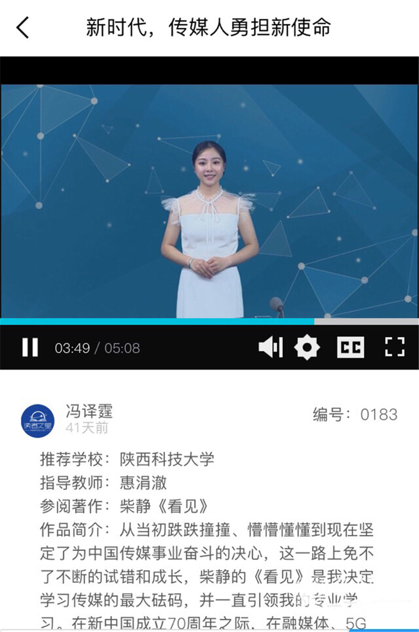 36365官网设艺学院学生冯译霆,平时酷爱读书,专业功底深厚,知行合一,积极参加图书馆组织的读书活动和社会实践活动,曾经在《图书馆报》发表《读书会带给我前行的力量》一文。这次她结合自己专业,选择柴静《看见》作为参阅著作,原创演讲文稿。在图书馆惠涓澈老师的指导下一次又一次对演讲稿进行修改,并在老师推荐下观看了其他读书演讲比赛的优秀获奖视频,在着装、录制背景方面力求高雅和谐。经过精心准备,终于以读书写作功底及演讲风采的专业魅力斩获“悦读之星”称号。